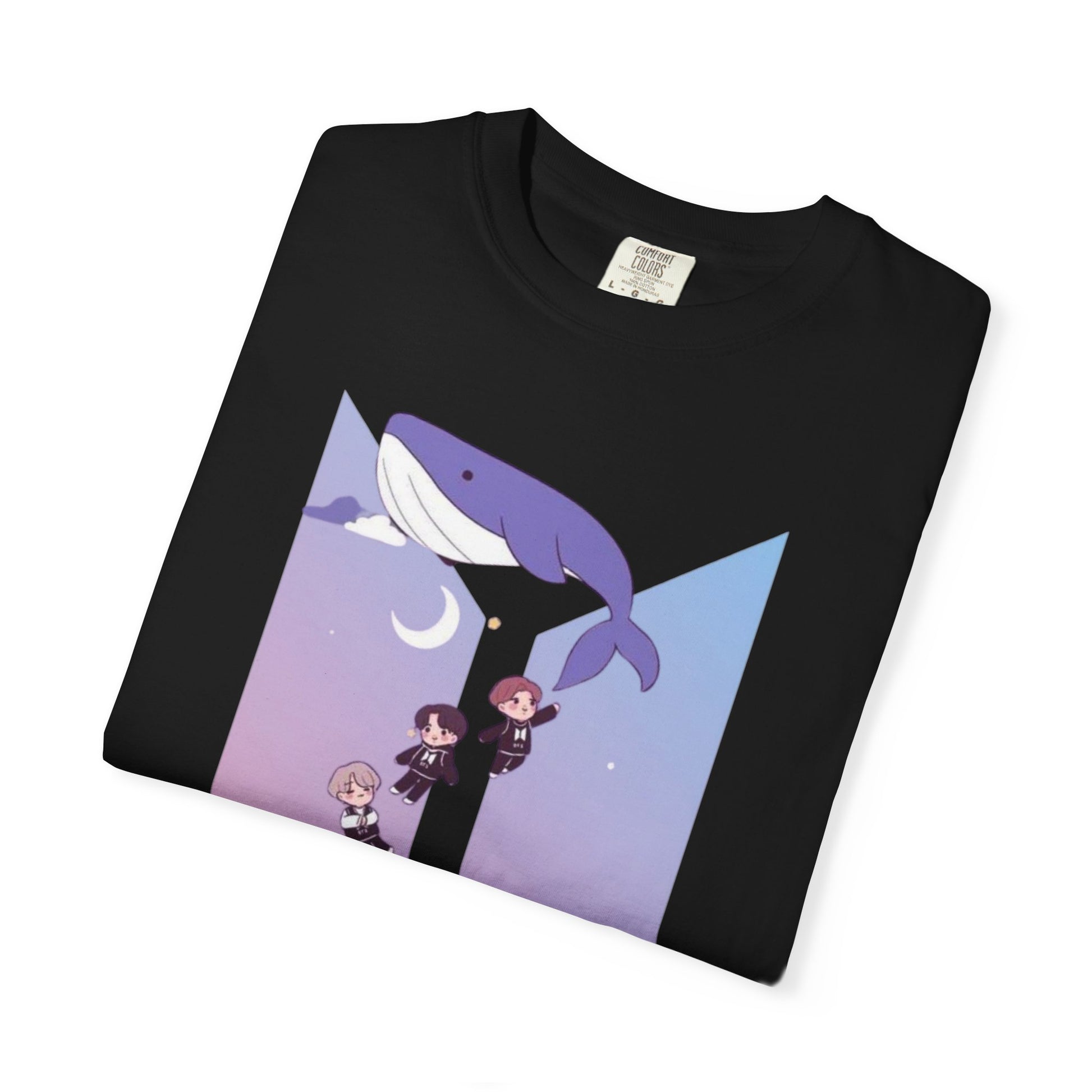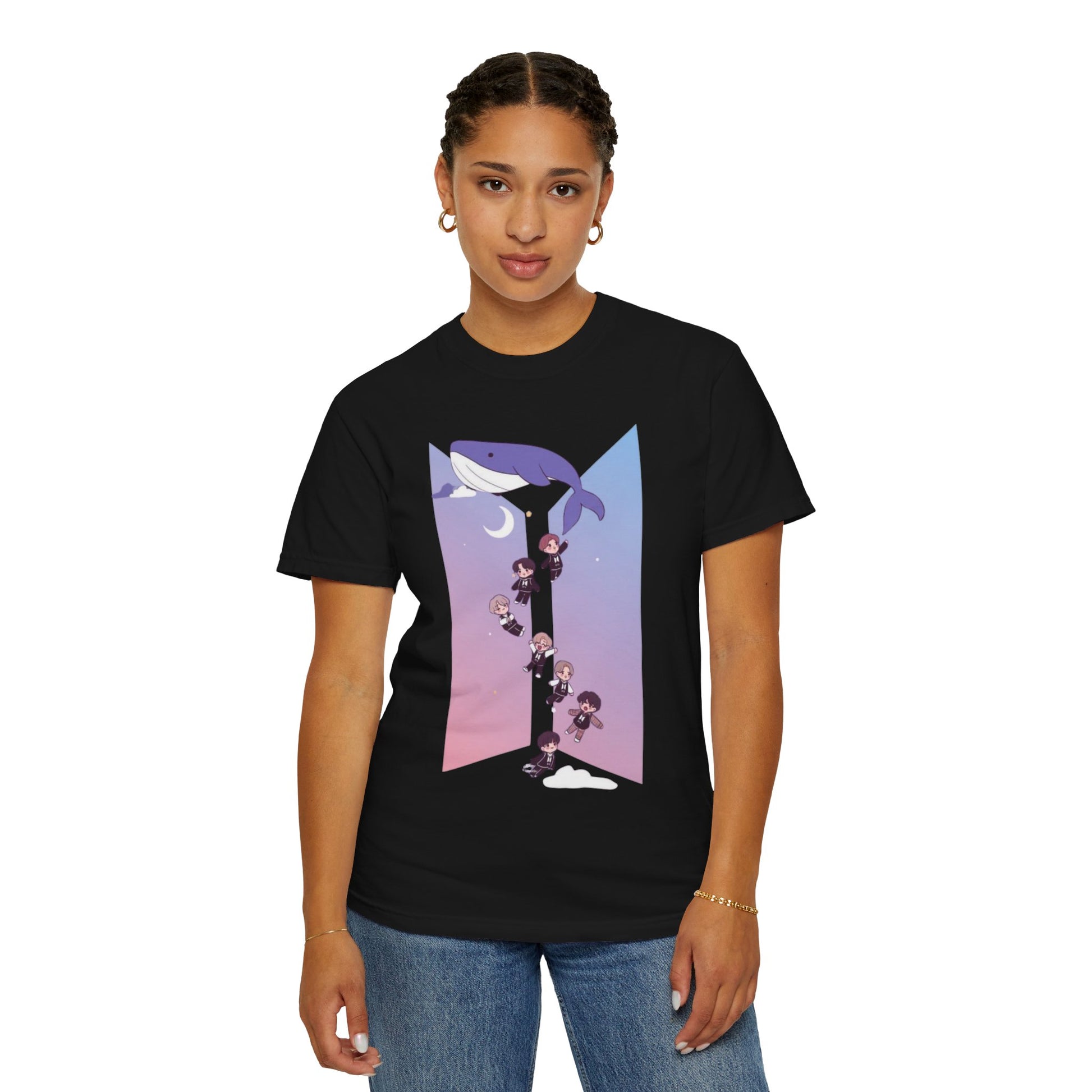 This relaxed-fit garment-dyed tee feels like a soft evening breeze. The watercolor-gradient print shows a gentle whale gliding above a moonlit chute of tiny, spirited characters — playful and quietly adventurous. Wear it to slow down after a long day, to share a smile with friends who love subtle, whimsical art, or to add a dreamy layer to your everyday wardrobe. The heavyweight cotton and garment-dyed finish give it a lived-in softness and muted, rich color that deepens with time and washing. It sits comfortably through long shifts, late-night meetups, or relaxed weekend outings — a small reminder of wonder in ordinary moments.