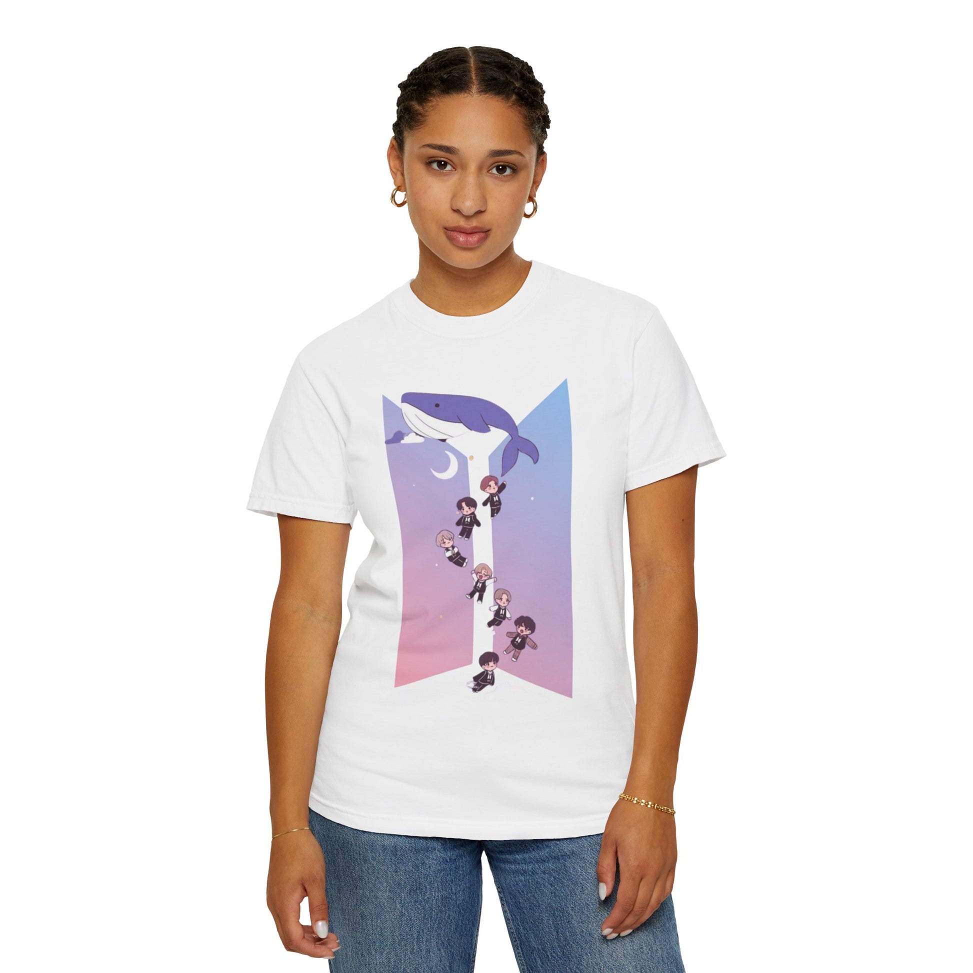 K-Pop Zodiac Whale Tee — Cute Chibi Band Members on Pastel Gradient T-Shirt
